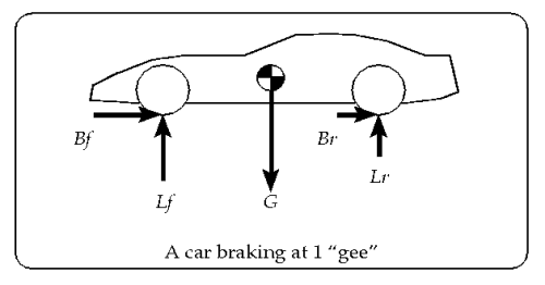 Braking causes Lf to be greater than Lr. Literally, the "rear end gets light," as one often hears racers say. Consider the front and rear braking forces, Bf and Br, in the diagram. They push backwards on the tyres, which push on the wheels, which push on the suspension parts, which push on the rest of the car, slowing it down. But these forces are acting at ground level, not at the level of the CG. The braking forces are indirectly slowing down the car by pushing at ground level, while the inertia of the car is 'trying' to keep it moving forward as a unit at the CG level.