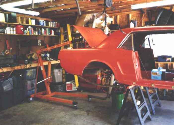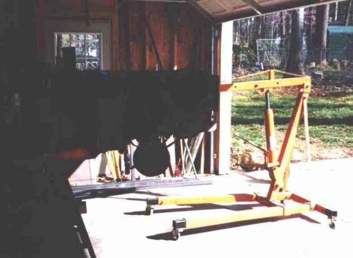 Using the engine hoist to lift the body high enough to slide the sawhorses