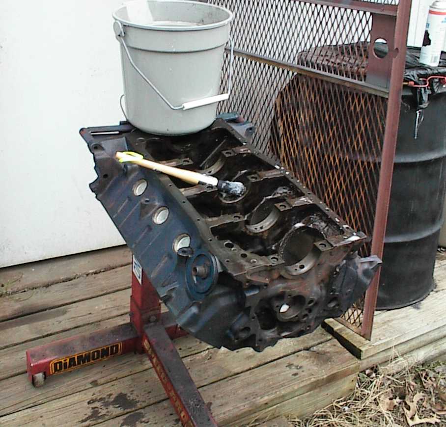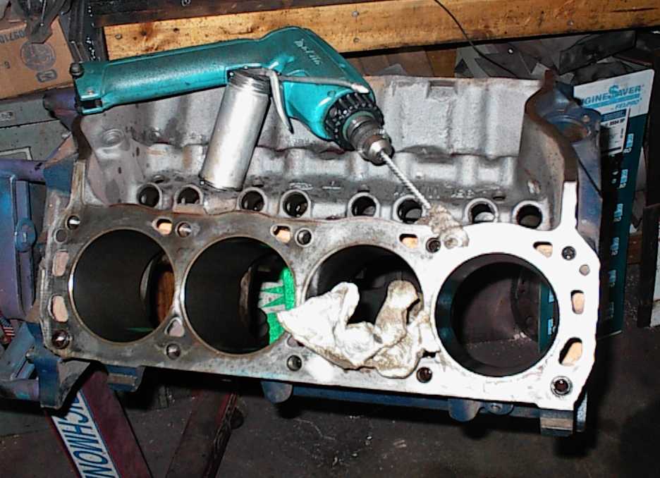Abrasive brush cleans up the lifter bores and deburrs the edges of the oil