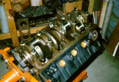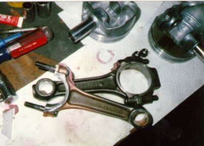 The rods are Chrysler small block. The pin ends have been reduced to .927 Chevy size with Federal-Mogul bronze bushings. They have also been narrowed to 1" to clear the inside of the KB piston bosses. The big ends have been narrowed to fit the Ford width journals. The rod bearings also had to be narrowed a bit. I had purchased ARP WaveLoc bolts, but the shank diameter was almost .020" too large to go into the Chrysler holes. Talked with ARP tech support were inconclusive. I eventually bought a set of Direct Connection bolts and used the ARP nuts on them.