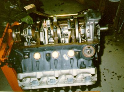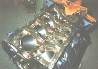 bottoms of bores and oil pan rails clearanced for long stroke