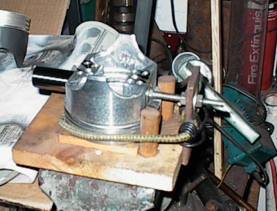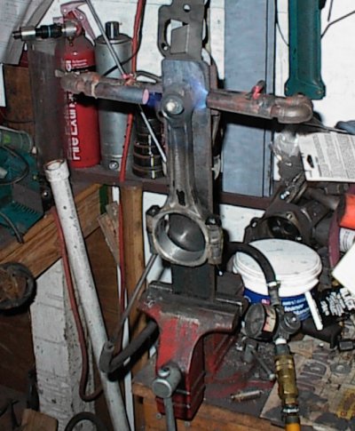 Piston in my homemade pin alignment fixture. Some guys can heat the rod and