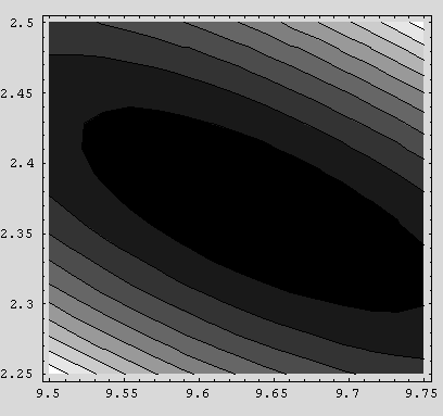Notice the timing: this plot took some time to produce, so we're having to wait a little for results. More importantly, notice the broad trough at the bottom, suggesting that a minimum can be found in the trough somewhere. A contour plot of the same region gives us even more confidence that we're on the correct archaeological site and can begin digging: