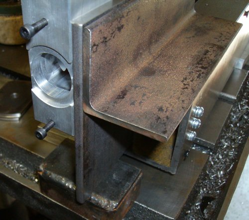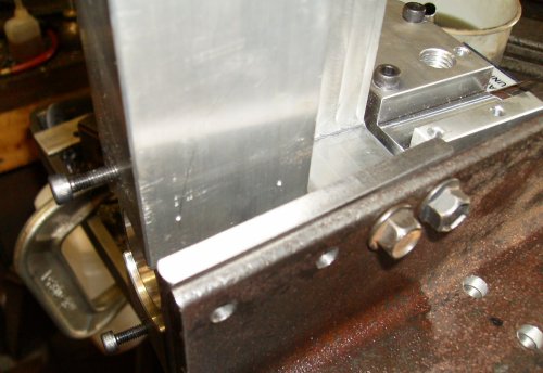 Down below the angle, you can see a 3/8" head screw going into the holes drilled and tapped into the motor bracket, and the two 7/16" screws along the top edge going into the holes we saw in the previous picture. Those screws go through clearance holes in the adapter plate.